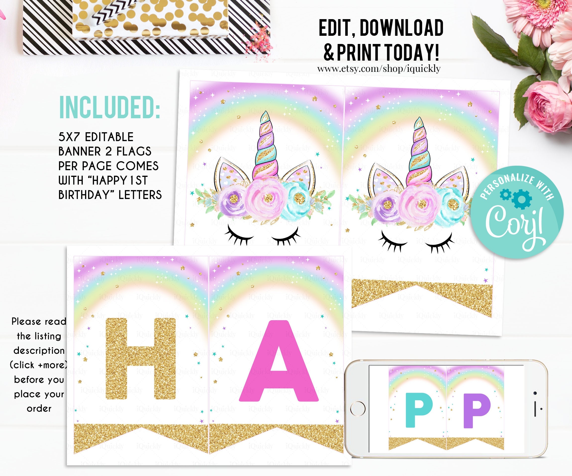 EDITABLE Unicorn Banner Happy Birthday Banner Printable 1st Birthday Buting Banner Baby Shower Template Boho Girl Instant Download Etsy