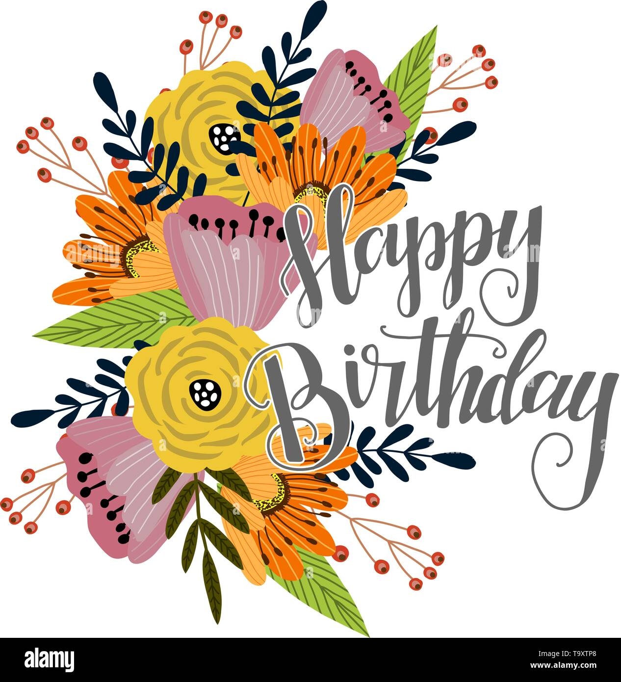 Happy Birthday Template For Cards And Banners With Cute Doodles Flowers With Text Vector Stock Vector Image Art Alamy