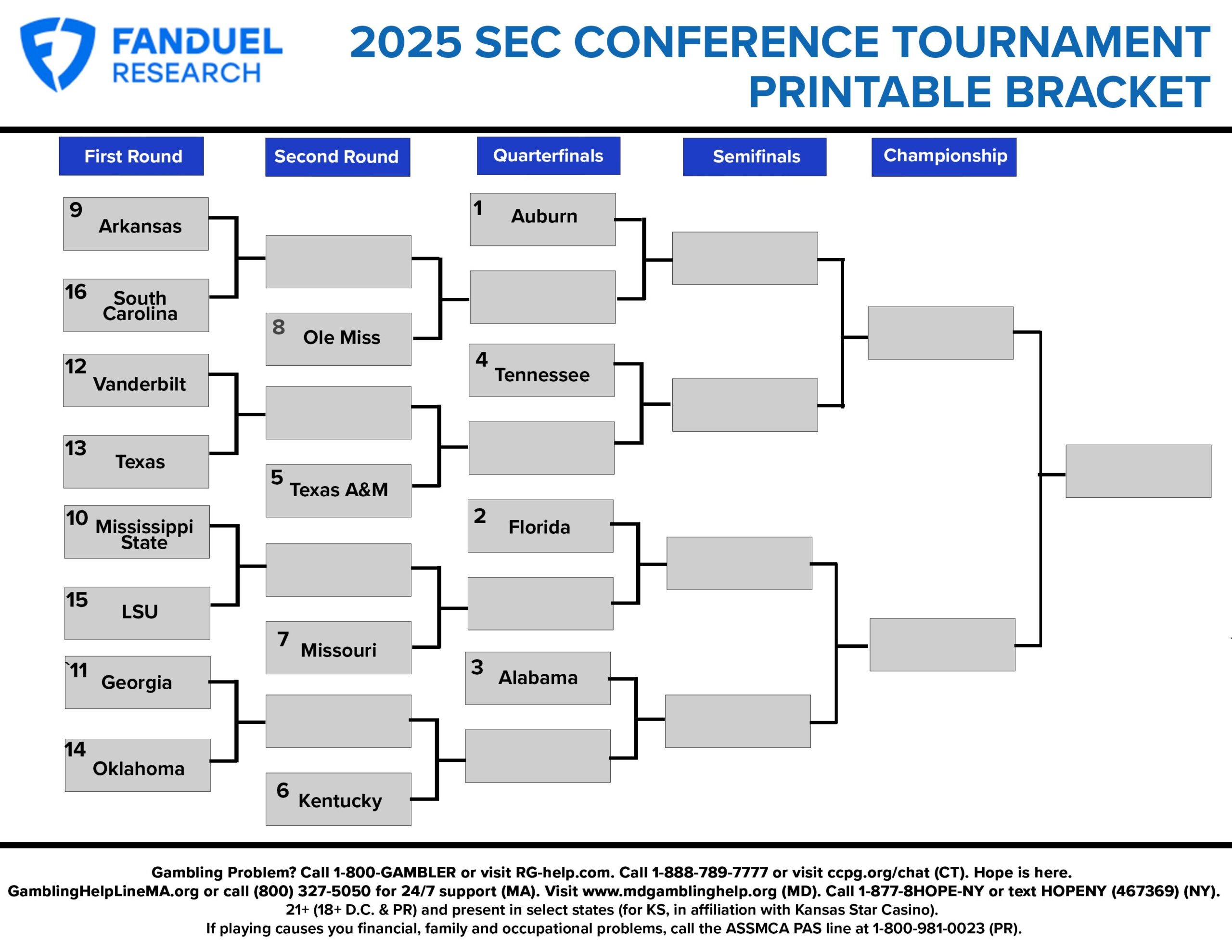 2025 SEC Basketball Printable Bracket For Conference Tournament FanDuel Research