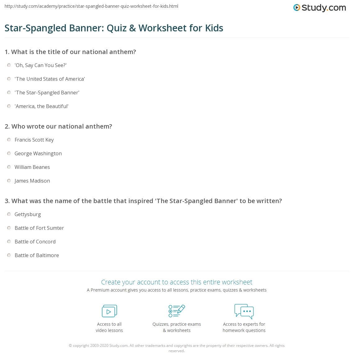 Star Spangled Banner Quiz Worksheet For Kids Study
