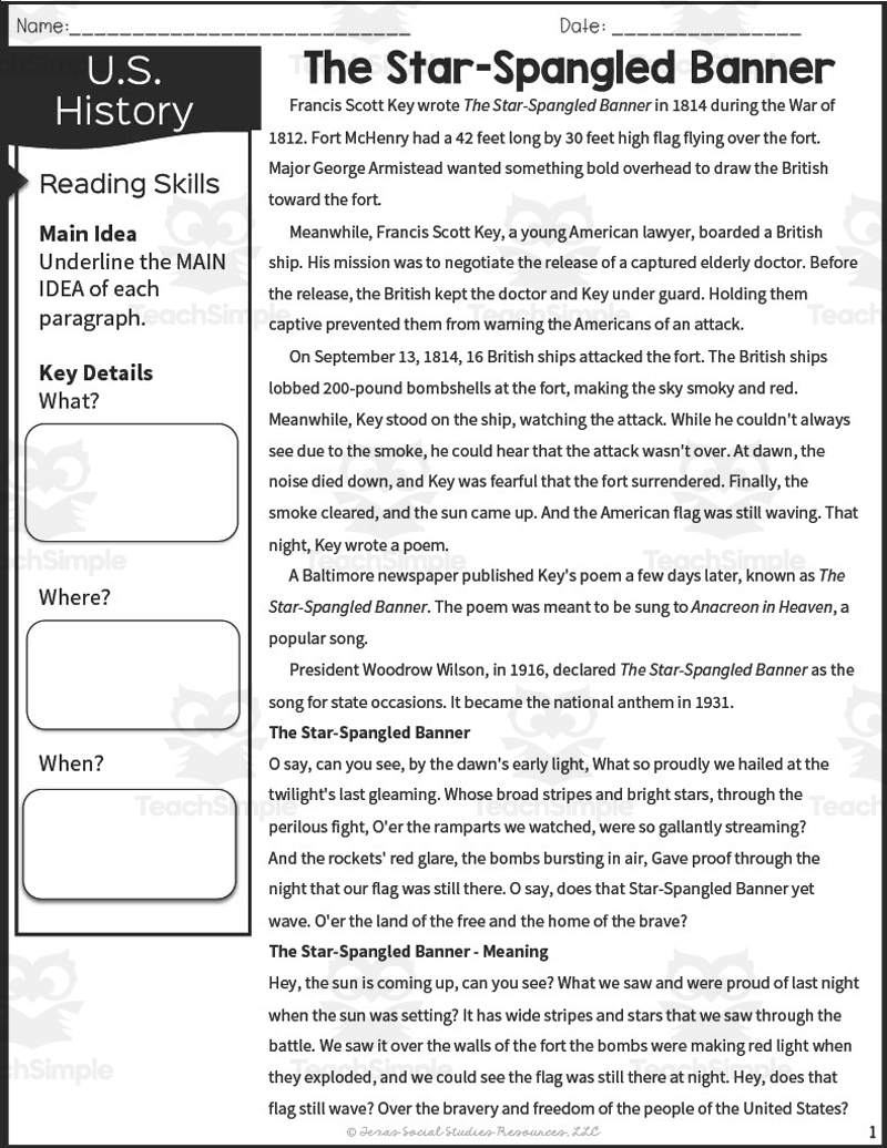 The Star Spangled Banner I Printable 2nd 3rd Grade TeacherVision Worksheets Library
